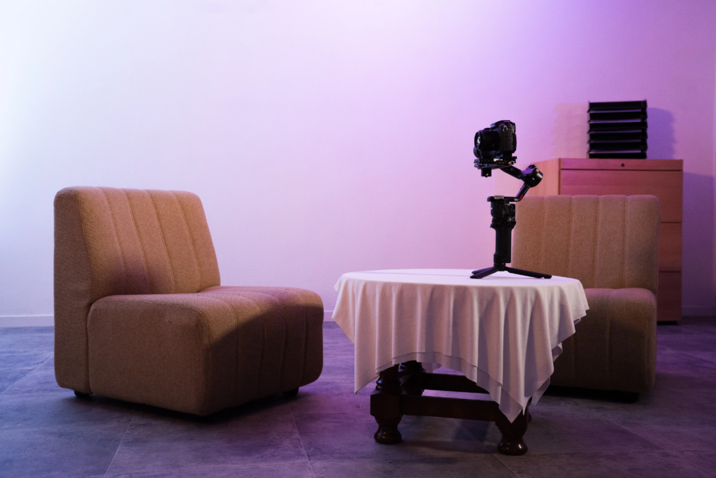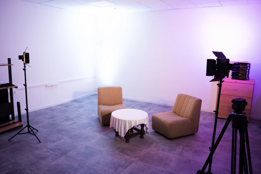 le plateau de tournage dispose d’un aménagement soigné avec une décoration adaptée aux productions audiovisuelles. L’espace est équipé pour garantir une bonne qualité d’image et un confort optimal lors des tournages. Il comprend deux petits fauteuils, parfaits pour les interviews ou échanges filmés, et un éclairage adapté aux prises de vue.